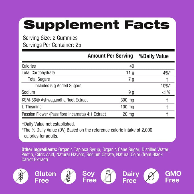Ingredients: KSM-66® Ashwagandha Root Extract 300 mg, L-Theanine, Passion Flower Extract, Organic Tapioca Syrup, Cane Sugar, Distilled Water, Pectin, Citric Acid, Natural Flavors, Natural Color, Sodium Citrate.