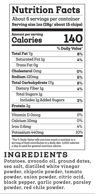 Ingredients: Potatoes, Avocado Oil, Ground Dates, Sea Salt, Distilled White Vinegar Powder, Chipotle Powder, Tomato Powder, Onion Powder, Citric Acid, Black Pepper, Garlic Powder, Parsley Powder, Red Chile Powder.