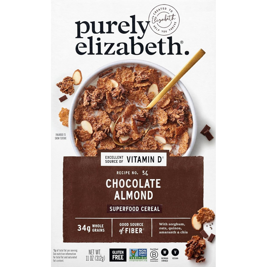 Purely Elizabeth is dedicated to crafting nutrient-rich, great-tasting foods made with high-quality, wholesome ingredients. The Chocolate Almond Cereal blends ancient grain flakes, crunchy superfood granola clusters, rich dark chocolate chunks, and sliced almonds for a deliciously satisfying start to your day.