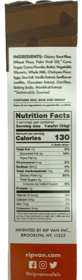 Ingredients: Chicory Root Fiber, Wheat Flour, Palm Fruit Oil, Cane Sugar, Cocoa Powder, Butter, Vegetable Glycerin, Whole Milk, Chickpea Flour, Eggs, Sea Salt, Vanilla Extract, Sunflower Lecithin, Chocolate Extract, Oat Fiber, Baking Soda, Monkfruit Extract.
