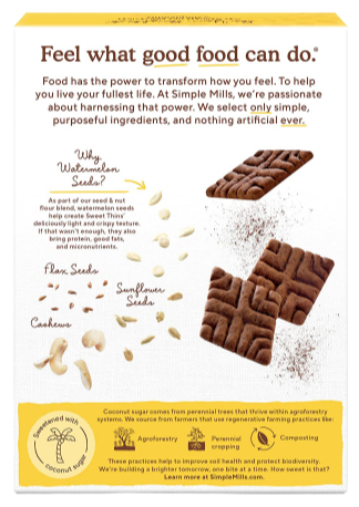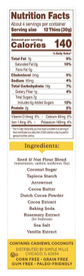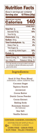 Ingredients: Seed, Nut Flour Blend (Watermelon, Cashew, Sunflower, Flax) Coconut Sugar Tapioca Starch Arrowroot Cocoa Butter Dutch Cocoa Powder Cocoa Extract Baking Soda Rosemary Extract (For Freshness) Sea Salt Vanilla Extract