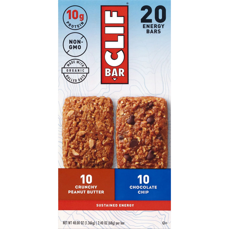 Boost your energy with this clif bar clif bar energy bar 20-count variety pack. Made with organic rolled oats, the natural energy in these energy bars is combined with great flavors and make for great healthy snacks on-the-go. Choose from crunchy peanut butter and chocolate chip flavors for versatile healthy snack ideas. Made with Organic Peanut Butter.
