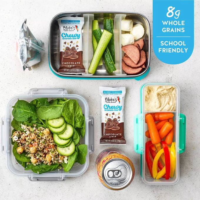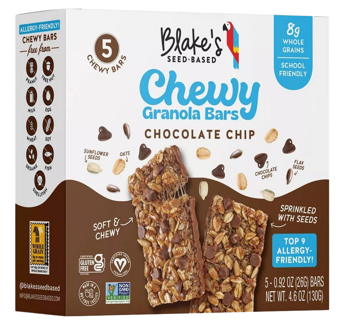 Ingredients: Brown Rice Syrup, Whole Grain Oat, Seeds (Sunflower Seed, Brown Flaxseed), Brown Rice, Palm Oil Shortening, Sugar, Semi-Sweet Chocolate Chips (Cane Sugar, Unsweetened Chocolate, Cocoa Butter, Vanilla Powder), Palm Kernel Oil, Grape Juice Concentrate, Cocoa Powder (Processed With Alkali), Agar, Natural Flavor, Salt, Sunflower Lecithin.