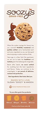 Ingredients: Soozy's Grain-free Flour Blend (Almond Flour, Tapioca Starch, Cassava Flour) Organic Palm Shortening Filtered Water Organic Coconut Sugar Organic Agave Syrup Chocolate Chips (Dried Cane Syrup, Natural Chocolate Liquor (Non-alcoholic), Non-dairy Cocoa Butter), Chia Seeds Vanilla Extract Baking Soda Sea Salt Sunflower Lecithin Rosemary Extract (For Freshness)