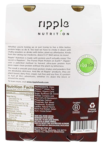 No more gritty protein shakes. Ripple Nutrition Chocolate Protein Shake is delicious, smooth, with rich cocoa and is packed with nutrition. Each bottle has 20g of plant-based protein from peas, 20% of your daily value of iron and only 9 grams of sugar.All Ripple Nutrition products are 100% dairy-free, vegan, nut-, soy- and gluten-free so you can enjoy worry-free. It’s protein to fuel all life’s adventures, whether it’s down the block or around the world.
