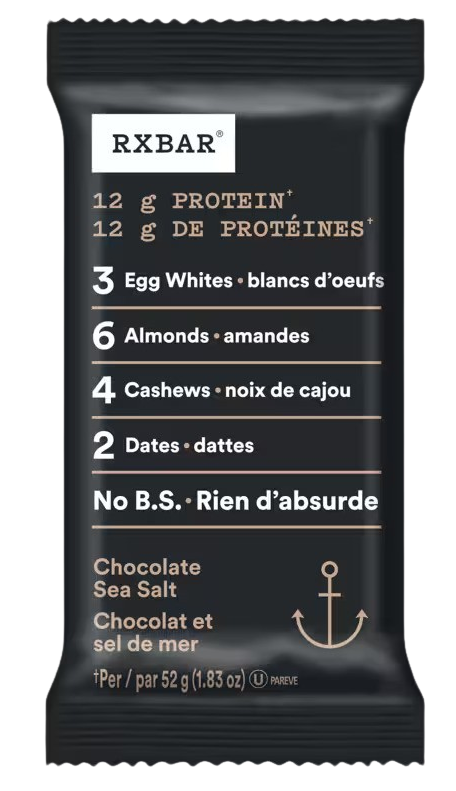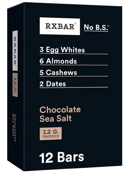 RXBAR’s Chocolate Sea Salt protein bars are made with real foods you can recognize. Just egg whites for protein, nuts for texture, and dates for natural sweetness, all wrapped in rich, salty-sweet chocolate.