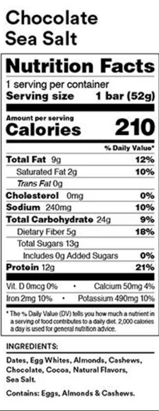 Ingredients: Dates, Egg Whites, Cashews, Almonds, Chocolate, Cocoa, Natural Flavors, Sea Salt.