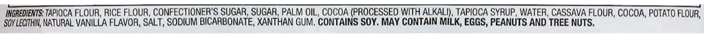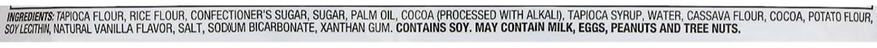 Ingredients: Tapioca Flour, Rice Flour, Vegetable Shortening (Palm Oil, Soybean Oil, Canola Oil, Alpha Tocopherol As An Antioxidant), Confectioners Sugar, Cocoa, Water, Tapioca Syrup, Corn Starch, Cassava Flour, Dextrose, Cocoa, Potato Flour, Soy Lecithin, Salt, Natural Vanilla Flavor, Sodium Bicarbonate, Xanthan Gum.