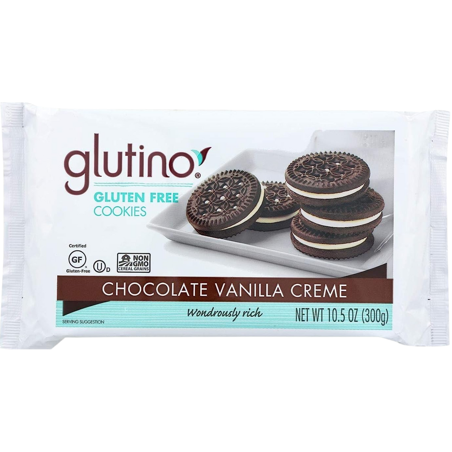 Glutino’s Chocolate Vanilla Creme Sandwich Cookies are a gluten-free twist on a classic, combining rich chocolate cookies with a creamy vanilla filling.