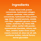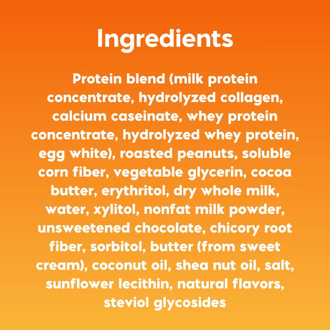 Ingredients: Milk Protein Blend (Milk Protein Concentrate, Whey Protein Concentrate, Hydrolyzed Casein), Dry Roasted Peanuts (12%), Hydrolyzed Collagen, Polydextrose, Cocoa Butter, Erythritol, Soluble Corn Fiber, Vegetable Glycerol, Milk, Egg Whites, Xylitol, Chocolate Liquor, Skim Milk, Chicory Root Fiber, Unsalted Butter from Sweet Cream, Sorbitol, Vegetable Oils (Coconut, Sheanut), Natural Flavors, Salt, Sunflower Lecithin, Steviol Glycosides.