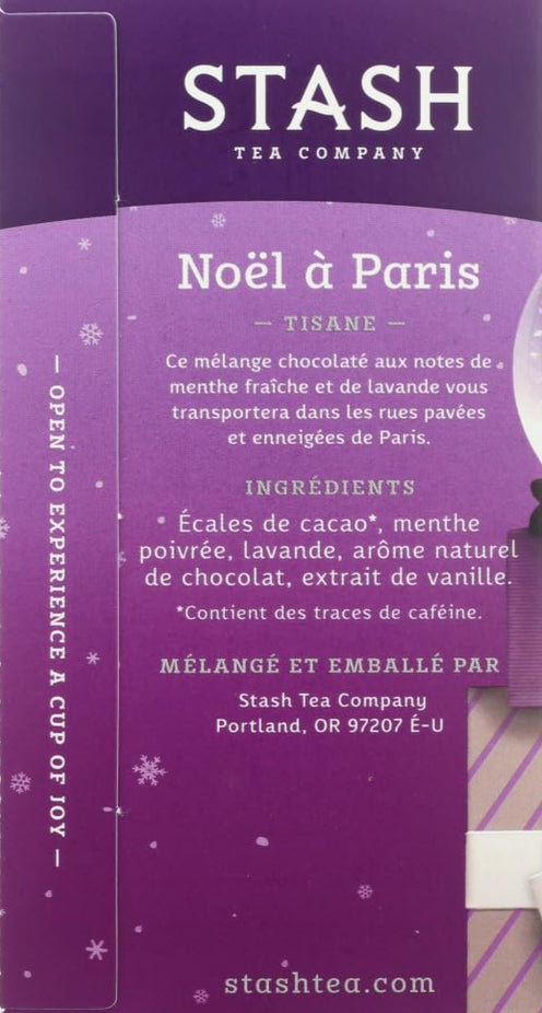 Stash Christmas in Paris Herbal Tea is a festive and indulgent blend featuring rich chocolate, fragrant lavender, and refreshing peppermint, perfect for cozy winter moments.