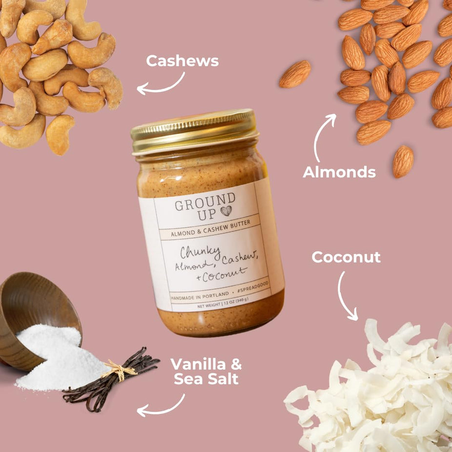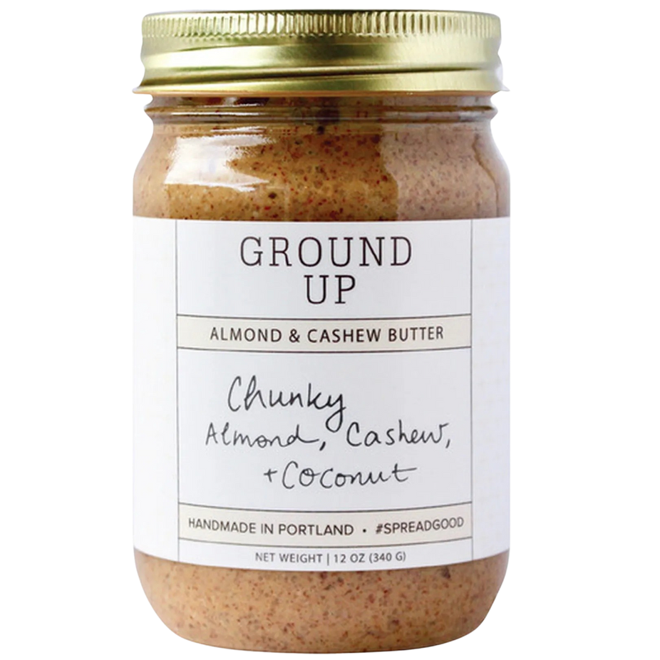 Ground Up Chunky Almond Cashew & Coconut Nut Butter is a salty-sweet spread with a rich, nutty flavor and a delightfully crunchy texture.
