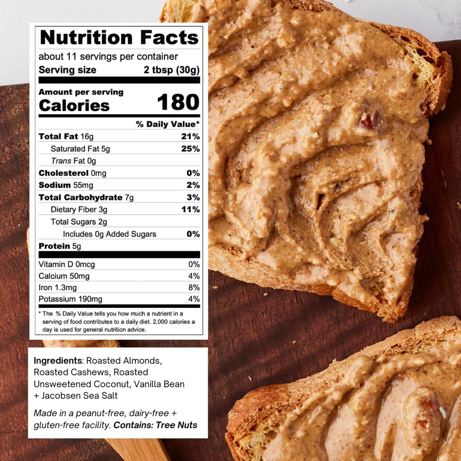 Ingredients: Roasted Almonds, Roasted Cashews, Roasted Unsweetened Coconut, Vanilla Bean + Jacobsen Sea Salt.