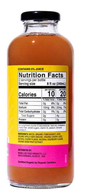 Ingredients: Water, Organic Pomegranate Juice, Organic Apple Cider Vinegar, Organic Cherry Juice, Natural Cherry Flavor, Natural Raspberry Flavor, Organic Monk Fruit Extract.
