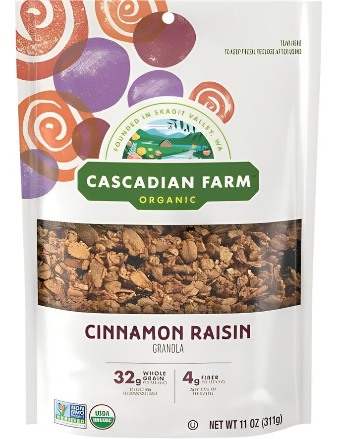 Cascadian Farm Organic Cinnamon Raisin Granola brings a delightful blend of cinnamon and raisins to your breakfast routine.