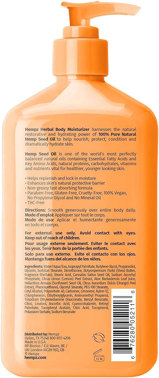 Ingredients: Water/aqua/eau, isopropyl palmitate, butylene glycol, propanediol, glycerin, sorbitan stearate, dimethicone, butyrospermum parkii (shea) butter, fragrance (parfum), stearic acid, cannabis sativa seed oil, sodium ascorbyl phosphate, citrus limon (lemon) peel extract, aloe barbadensis leaf juice, helianthus annuus (sunflower) seed oil, citrus aurantium dulcis (orange) peel extract, phenoxyethanol, glyceryl stearate, PEG-100 stearate, cetyl alcohol, polysorbate 40, carbomer, limonene, nylon-12, chlorphenesin, ethylhexylglycerin, aminomethyl propanol, trisodium ethylenediamine disuccinate, benzyl benzoate, citral, linalool, ascorbic acid, cyanocobalamin, retinyl palmitate, tocopheryl acetate, citric acid, tocopherol, potassiums sorbate, sodium benzoate.