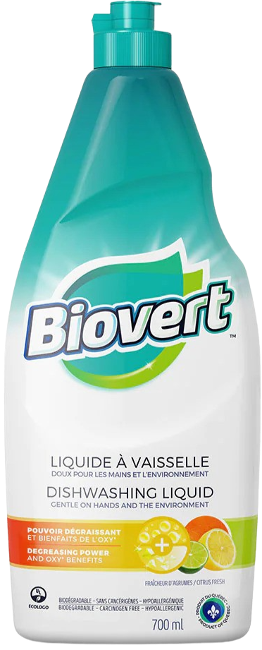 Biovert Dishwashing Liquid - Citrus Fresh Scent 700 ml is an ally of choice in your kitchen! Discover the benefits of its oxy-bio formula that stimulates the effect of dishwashing liquid and increases its potential. In addition to neutralizing odors, removing adhesive residues, cleaning and disinfecting dishes. It is therefore hard for the spots, while remaining soft for your hands. Biodegradable* Not tested on animals Safe for Septic tanks Scent: Citrus Fresh Pour 2 ml of dishwashing liquid per liter of water.