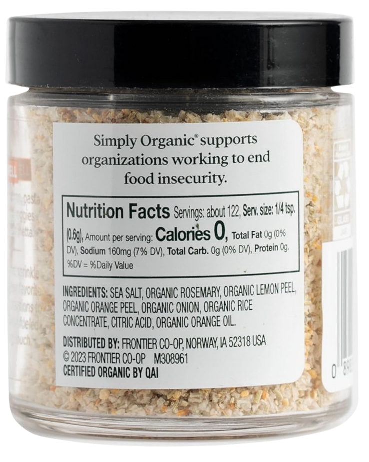 Ingredients: Sea Salt, Organic Rosemary, Organic Lemon Peel, Organic Orange Peel, Organic Onion, Organic Rice Concentrate, Citric Acid, Organic Orange Oil.