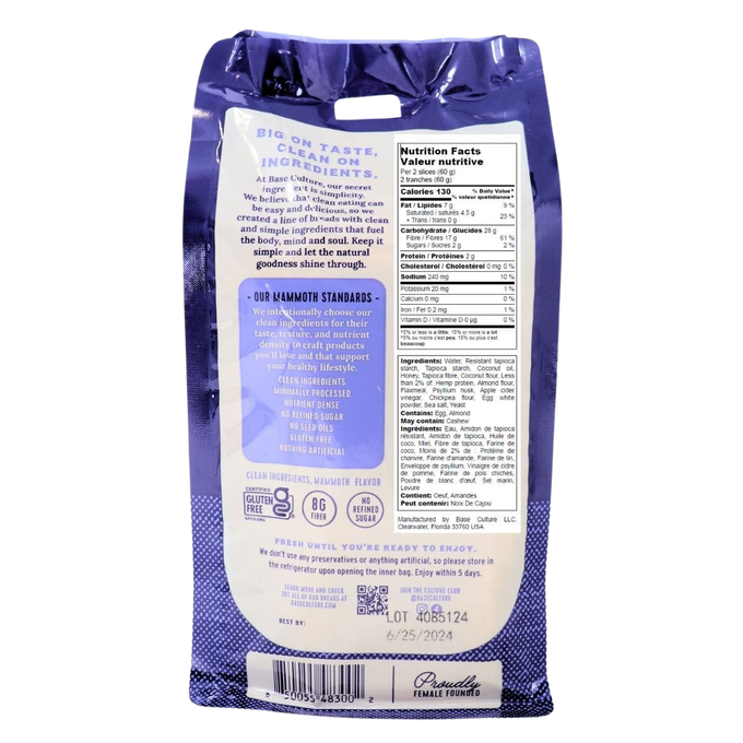 Ingredients: Water, Resistant Tapioca Starch, Tapioca Starch, Coconut Oil, Honey, Tapioca Fiber, Coconut Flour, Less Than 2% Of: Hemp Protein, Almond Flour, Flaxmeal, Psyllium Husk, Apple Cider Vinegar, Chickpea Flour, Egg White Powder, Sea Salt, Yeast.