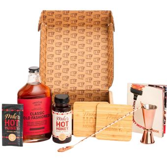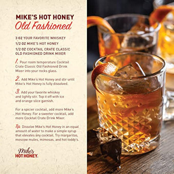 Ingredients: Mike's Hot Honey (10 oz) - Classic Old Fashioned Cocktail Mix (12.7 FL oz) - 2 Mike's Hot Honey coasters - 1 Rose gold double sided cocktail jigger - 1 Rose gold bar spoon - 1 Mike's Hot Honey Extra Hot Packet (0.5oz) - 1 Mike's Hot Honey Recipe & Inspiration Booklet
