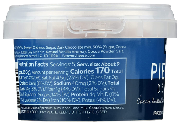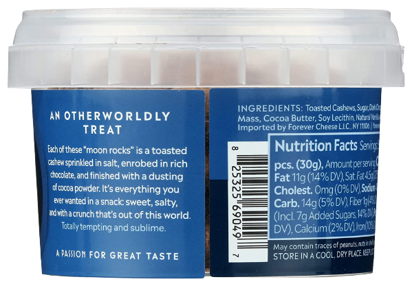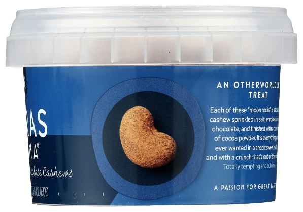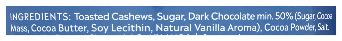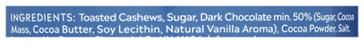 Ingredients: Toasted Cashews, Sugar, Dark Chocolate Min. 50% (sugar, Cocoa Mass, Cocoa Butter, Soy Lecithin, Natural Vanilla Aroma), Cocoa Powder, Salt.