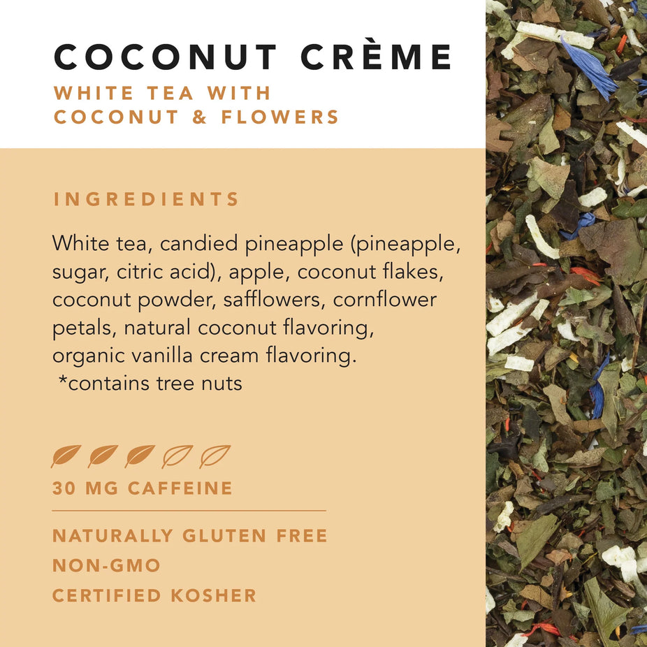 Ingredients: White Tea, Candied Pineapple (Pineapple, Sugar, Citric Acid), Apple, Coconut Flakes, Coconut Powder, Safflowers, Cornflower Petals, Natural Coconut Flavoring, Organic Vanilla Cream Flavoring.