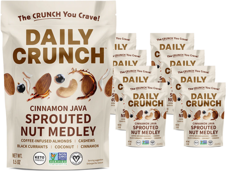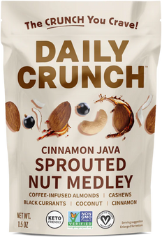 Their Sprouted Almonds and Cashews - Cinnamon Java and Coffee Soaked blend offers a uniquely crunchy, bold-flavored snack.