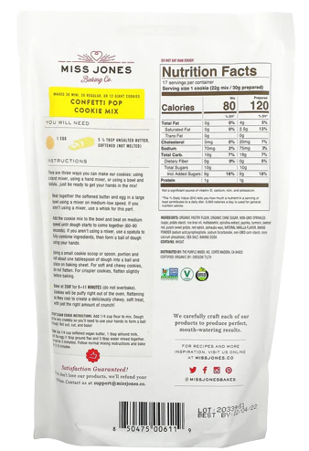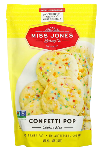 Ingredients: Organic Pastry Flour, Organic Cane Sugar, Non-Gmo Sprinkles (Sugar, Potato Starch, Vegetable Fat (Palm), Maltodextrin, Colors (Anthocyanins, Paprika, Turmeric, Beetroot Red, Spirulina), Natural Vanilla Flavor, Baking Powder (Sodium Acid Pyrophosphate, Sodium Bicarbonate, Non-Gmo Corn Starch, Mono Calcium Phosphate), Sea Salt, Baking Soda