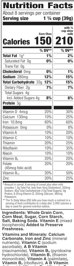Ingredients: Whole Grain Corn, Corn Meal, Sugar, Corn Starch, Salt, Baking Soda. Vitamin E (mixed tocopherols) Added to Preserve Freshness. Vitamins and Minerals: Calcium Carbonate, Iron and Zinc (mineral nutrients), Vitamin C (sodium ascorbate), A B Vitamin (niacinamide), Vitamin B6 (pyridoxine hydrochloride), Vitamin B1 (thiamin mononitrate), Vitamin A (palmitate), Vitamin B2 (riboflavin), A B Vitamin (folic acid), Vitamin B12, Vitamin D3.