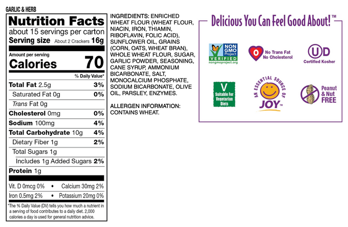 Ingredients: Enriched Wheat Flour (Wheat Flour, Niacin, Iron, Thiamin, Riboflavin, Folic Acid), Sunflower Oil, Grains (Corn, Oats, Wheat Bran), Whole Wheat Flour, Sugar, Garlic Powder, Seasoning, Cane Syrup, Ammonium Bicarbonate, Salt, Monocalcium Phosphate, Sodium Bicarbonate, Olive Oil, Parsley, Enzymes.