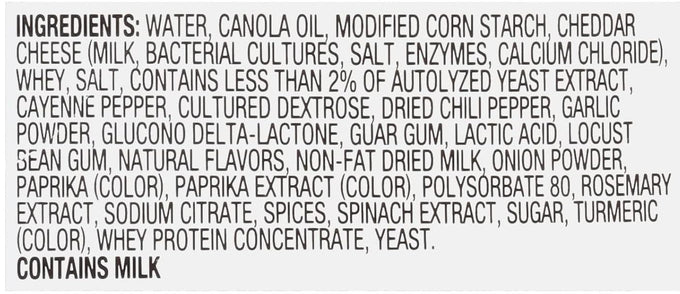 Ingredients: Water, Canola Oil, Modified Corn Starch, Cheddar Cheese (Milk, Bacterial Cultures, Salt, Enzymes, Calcium Chloride), Whey, Salt, Contains Less Than 2% Of Autolyzed Yeast Extract, Cayenne Pepper, Cultured Dextrose, Dried Chili Pepper, Garlic Powder, Glucono Delta-Lactone, Guar Gum, Lactic Acid, Locust Bean Gum, Natural Flavors, Non-Fat Dried Milk, Onion Powder, Paprika (Color), Paprika Extract (Color), Polysorbate 80, Rosemary Extract, Sodium Citrate, Spices, Spinach Extract, Sugar, Turmeric (Color), Whey Protein Concentrate, Yeast.