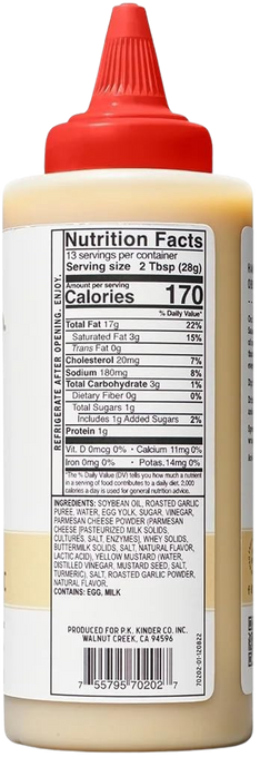 Ingredients: Soybean Oil, Roasted Garlic Puree, Water, Egg Yolk, Sugar, Vinegar, Parmesan Cheese Powder (Parmesan Cheese [pasteurized Milk Solids, Cultures, Salt, Enzymes], Whey Solids, Buttermilk Solids, Salt, Natural Flavor, Lactic Acid), Yellow Mustard (Water, Distilled Vinegar, Mustard Seed, Salt, Turmeric), Salt, Roasted Garlic Powder, Natural Flavor.