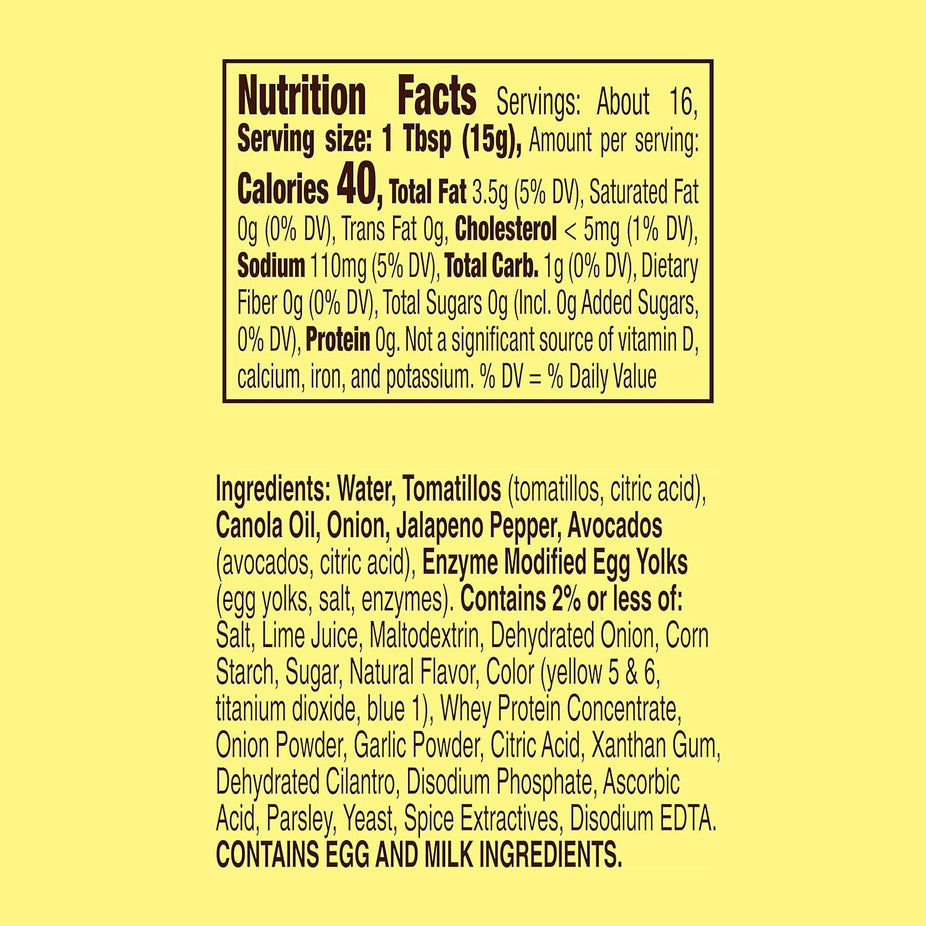 Ingredients: Water, Tomatillos (Tomatillos, Citric Acid), Canola Oil, Onion, Jalapeno Pepper, Avocados (Avocados, Citric Acid), Enzyme Modified Egg Yolks (Egg Yolks, Salt, Enzymes). Contains 2% Or Less Of: Salt, Lime Juice, Maltodextrin, Dehydrated Onion, Corn Starch, Sugar, Natural Flavor, Color (Yellow 5 & 6, Titanium Dioxide, Blue 1), Whey Protein Concentrate, Onion Powder, Garlic Powder, Citric Acid, Xanthan Gum, Dehydrated Cilantro, Disodium Phosphate, Ascorbic Acid, Parsley, Yeast, Spice Extractives, Disodium Edta.