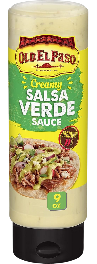 Spice up your taco night with Old El Paso Creamy Salsa Verde sauce in a squeezable bottle! This smooth, tangy sauce combines the bright taste of green chilies and tomatillos with a creamy finish, perfect for tacos, burritos, or as a dip. Add a burst of flavor to your favorite dishes with this versatile and delicious sauce.
