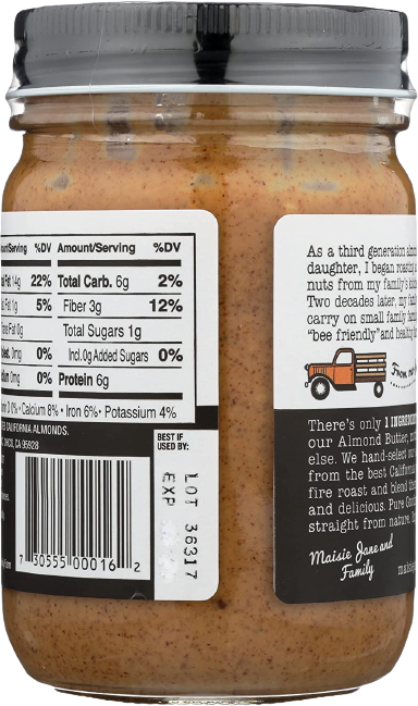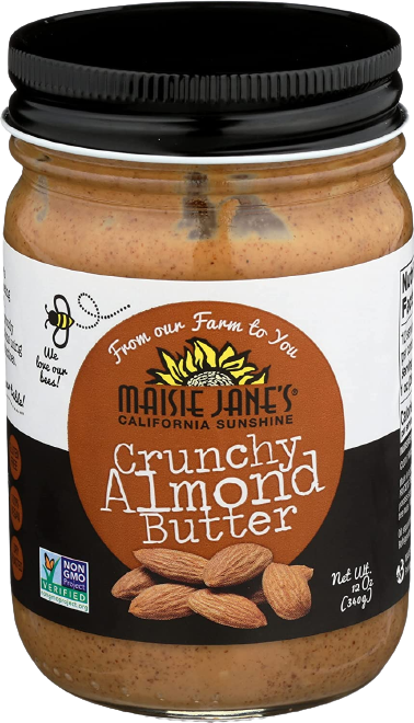 Maisie Jane's Almond Butter is a smart, tasty alternative to peanut butter! Having no cholesterol, and less fattening with fewer calories than peanut butter, there is no reason not to try it! Almond Butter is bursting with flavor - surprisingly, it is made from 100% dry roasted almonds, with no other ingredients! Offered in crunchy and smooth, you can enjoy it in a variety of ways: on sliced apples, as an almond butter and jelly sandwich, or to make incredible almond butter cookies!