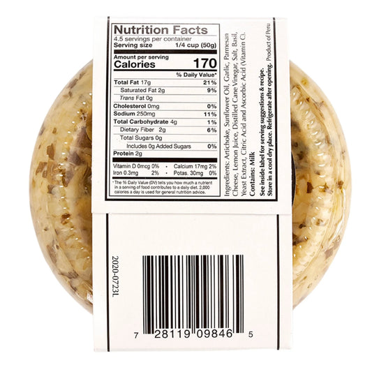 Ingredients: Artichoke, Sunflower Oil, Garlic, Parmesan Cheese, Lemon Juice, Distilled Cane Vinegar, Salt, Basil, Yeast Extract, Citric Acid And Ascorbic Acid (Vitamin C).