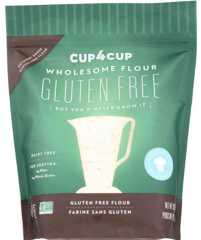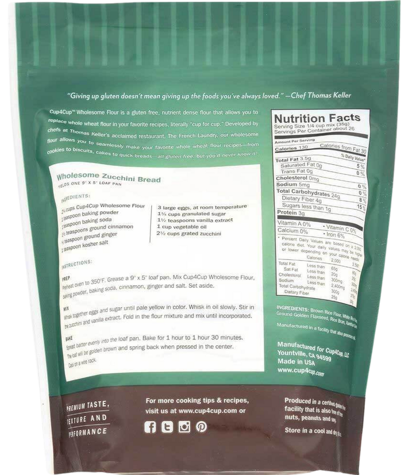 Cup4Cup’s™ Wholesome Flour is the only non-GMO verified, nutrient-rich, dairy-free, gluten-free, 1:1 substitution for whole wheat flour that is a source of fiber and omega fatty acids. Healthy additions like ground golden flaxseeds and rice bran deliver 3g of fiber, 3g of protein, 928mg of Omega-3 fatty acids and 10g of whole grains per serving, making this gluten free flour a healthy and versatile option for cooking and baking that won’t change the taste of your favorite recipes.