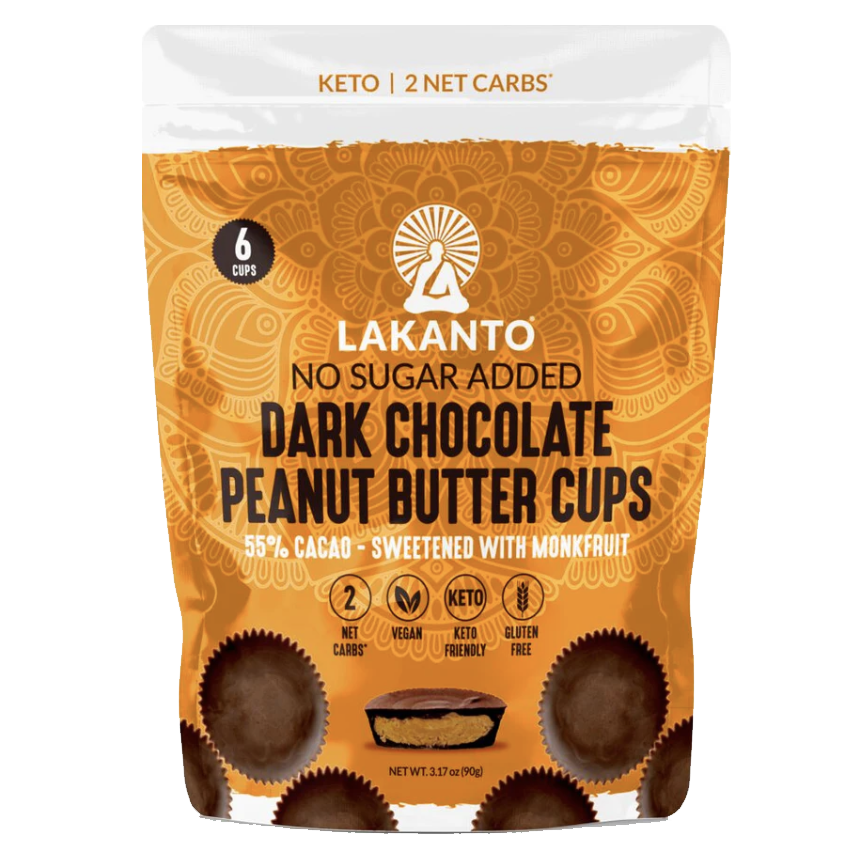 Lakanto Dark Chocolate Peanut Butter Cups offer a rich, indulgent bite made with creamy peanut butter and monk fruit–sweetened dark chocolate.