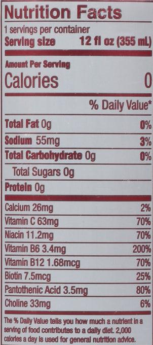 Ingredients: Carbonated Water, Citric Acid, Taurine, Natural Flavor, Sodium Citrate, Calcium Lactate, Guarana Seed Extract, Fruit and Vegetable Juice for Color, Ascorbic Acid (Vitamin C), Green Tea Extract, Choline Bitartrate, Natural Caffeine, Sucralose, L-Carnitine, Green Tea Polyphenols (ECGG), Ginger Root Extract, Niacinamide (Vitamin B-3), Gum Acacia, D-Calcium Pantothenate (Vitamin B-5), Pyridoxine Hydrochloride (Vitamin B-6), Biotin, Cyanocobalamin (Vitamin B-12).