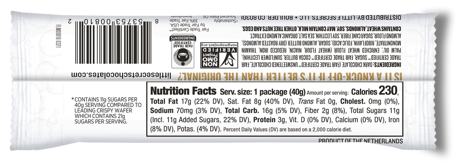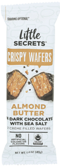 Layers of creamy almond butter pressed between light and crispy wafers are dredged in fair trade certified™ dark chocolate and sprinkled with sea salt. All ingredients are responsibly-sourced with no artificial flavors or high-fructose corn syrup.