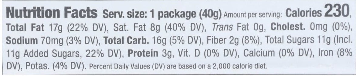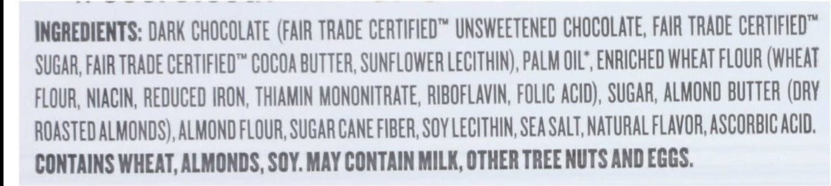 Ingredients: Dark Chocolate (Fair Trade Certified™ Unsweetened Chocolate, Fair Trade Certified™ Sugar, Fair Trade Certified™ Cocoa Butter, Sunflower Lecithin), Palm Oil*, Enriched Wheat Flour (Wheat Flour, Niacin, Reduced Iron, Thiamin Mononitrate, Riboflavin. Folic Acid), Sugar, Almond Butter (Dry Roasted Almonds), Almond Flour, Sugar Cane Fiber, Soy Lecithin, Sea Salt, Natural Flavor, Ascorbic Acid.