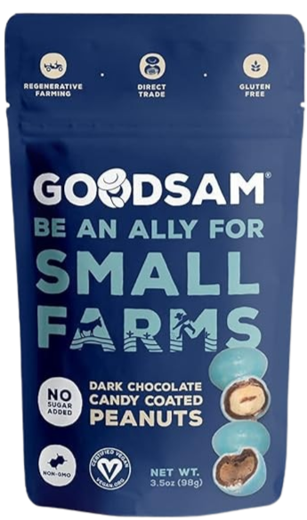 Ingredients: Roasted Peanuts*, 55% Dark Chocolate (Cacao Mass*, Allulose^, and Cacao Butter*), Isomaltulose (from Beet Sugar^), Calcium Carbonate, Coloring (Spirulina Concentrate+, Sucrose+, Citric Acid), Gum Arabic+, Carnauba wax+.