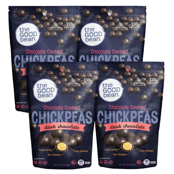 Ingredients: Dark Chocolate (Unsweetened Chocolate, Sugar, Cocoa Butter, Soy Lecithin (an Emulsifier), Natural Vanilla Extract), Chick Peas (Non-GMO Chick Peas, (Contains One or More of the Following: Non-GMO Canola, Sunflower or Safflower Oil), Sea Salt), Cane Sugar, Powdered Sugar (Powdered Cane Sugar, Corn Starch), Caramel Color, Tapioca Dextrin, Carnauba Wax (Made from Palm Leaves), Gum Arabic, and Natural Color.