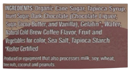 Ingredients: Organic Cane Sugar, Tapioca Syrup, Invert Sugar, Dark Chocolate (Chocolate Liquor, Sugar, Cocoa Butter*, Vanilla), Gelatin**, Water, Natural Cold Brew Coffee Flavor, Coffee, Fruit And Vegetable Juice For Color, Sea Salt, Tapioca Starch