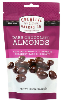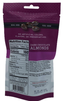 Ingredients: Dark Chocolate (Sugar, Chocolate Liquor [Processed with Alkali], Cocoa Butter, Milk Fat, Soy Lecithin [an Emulsifier],and Vanilla), Almonds [Almonds, Canola Oil), Corn Syrup, Modified Starch (Tapioca), Confection's Glaze