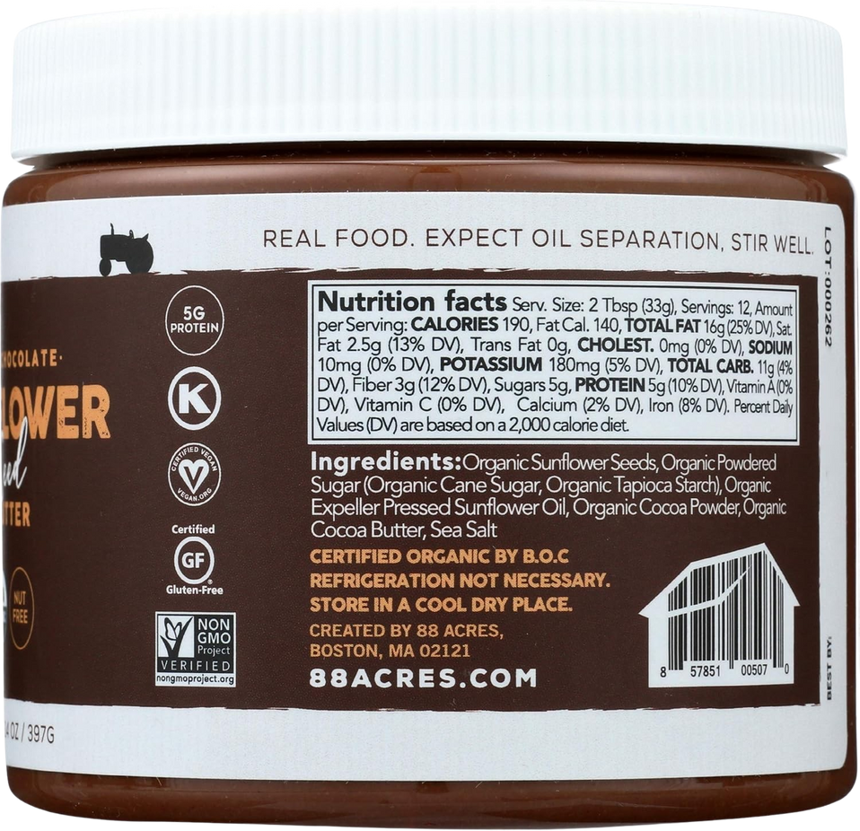 88 Acres Dark Chocolate Sunflower Seed Butter delivers a rich, chocolatey flavor crafted with roasted sunflower seeds and organic cocoa.