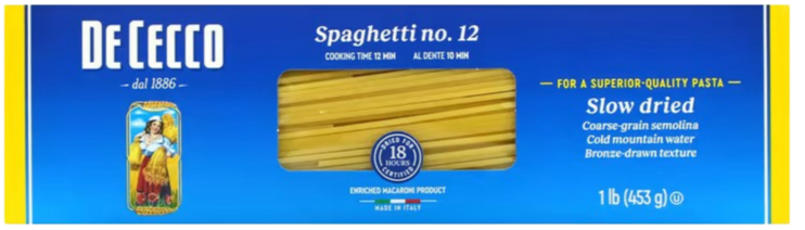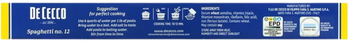 Ingredients: Durum Wheat Semolina, Vitamins (Niacin, Thiamine Mononitrate, Riboflavin, Folic Acid), Iron (Ferrous Lactate).