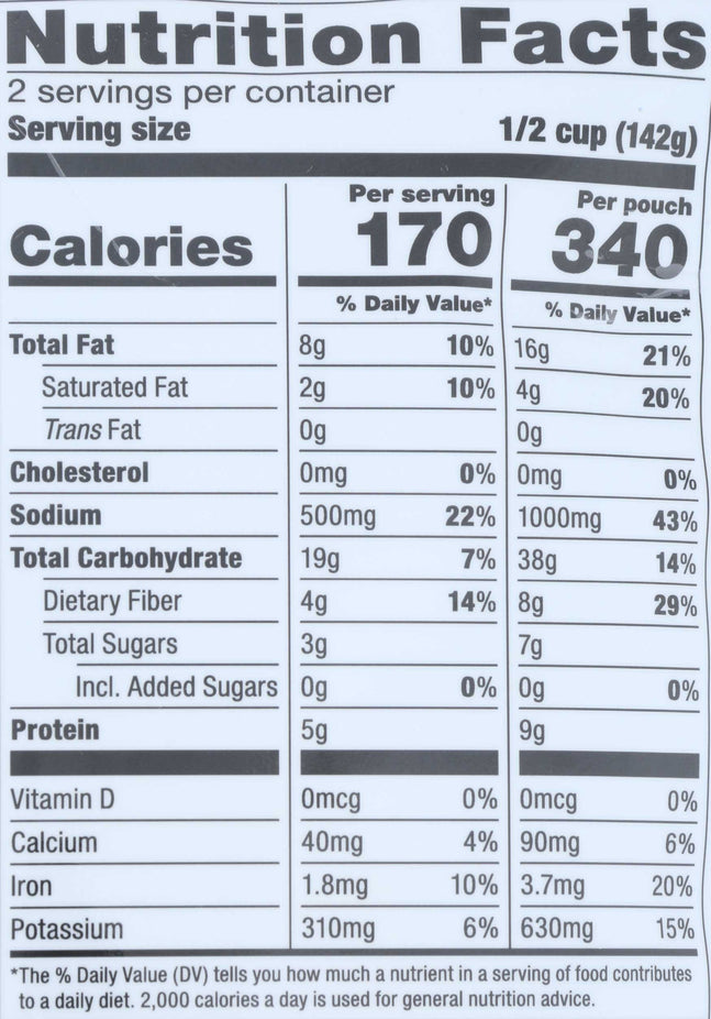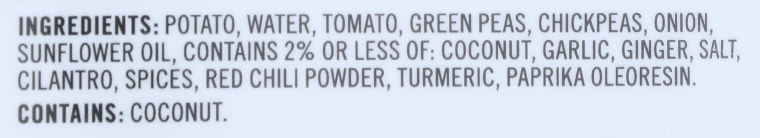 Ingredients: Potato, Water, Tomato, Green Peas, Chickpeas, Onion, Sunflower Oil, Contains 2% Or Less Of: Coconut, Garlic, Ginger, Salt, Cilantro, Spices, Red Chili Powder, Turmeric, Paprika Oleoresin.