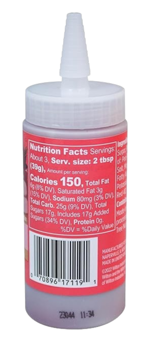 Ingredients: Wheat Glucose Syrup, Sugar, Palm Oil, Water 2% Or Less Of: Pea Protein, Natural Flavor, Salt, Mono And Diglycerides Of Fatty Acids, Citric Acid, Glycerin, Potassium Sorbate (Preservative), Red 40, Tellow 5.