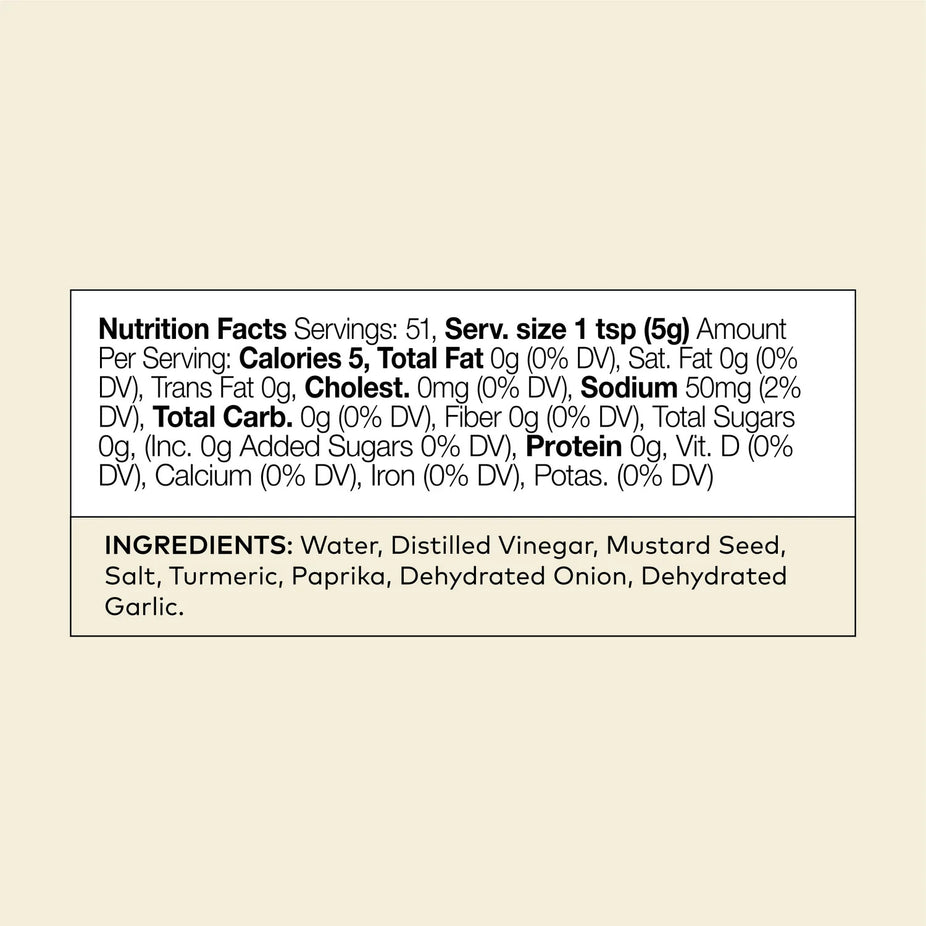 Ingredients: Water, Distilled Vinegar, Mustard Seed, Salt, Turmeric, Paprika, Dehydrated Onion, Dehydrated Garlic.